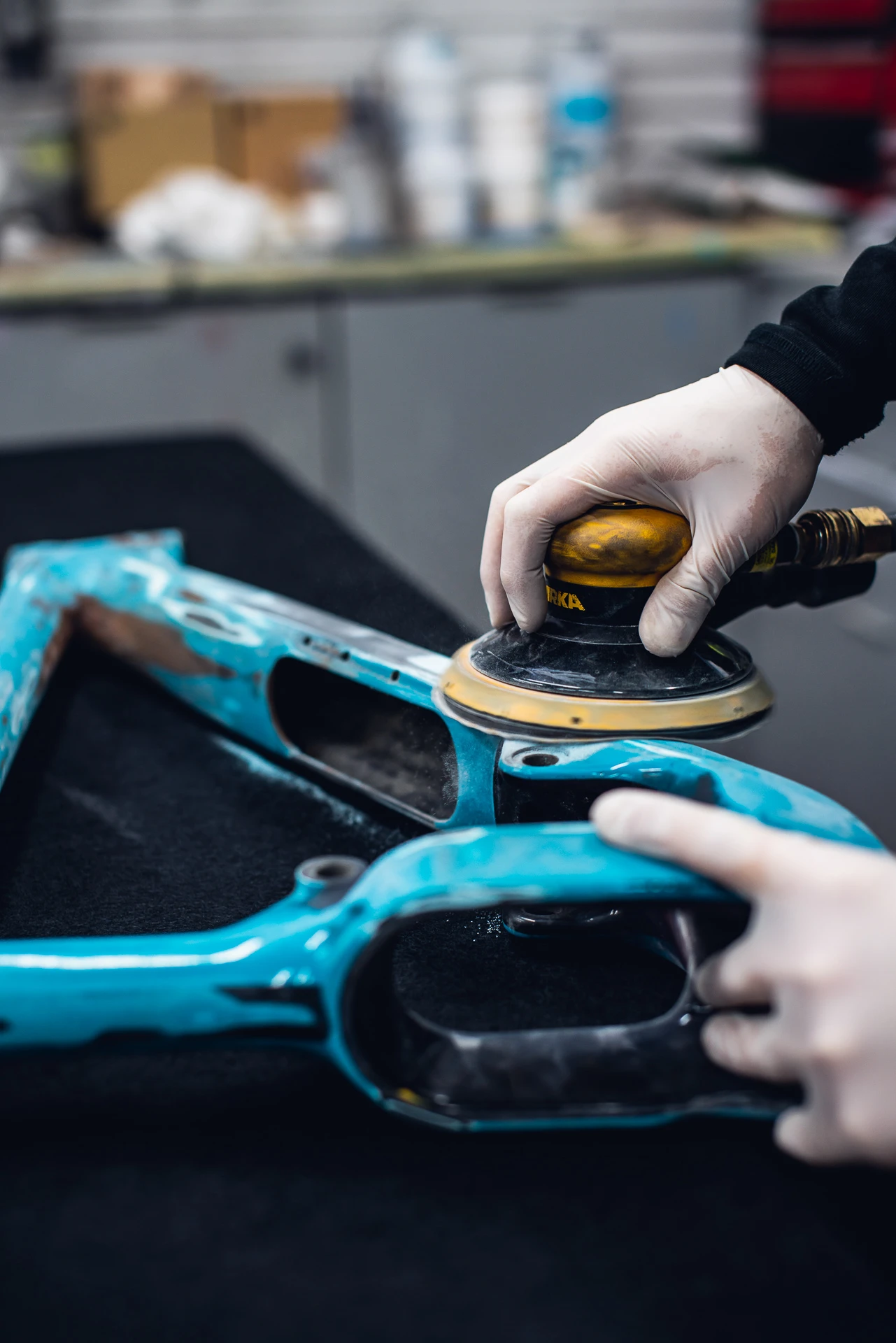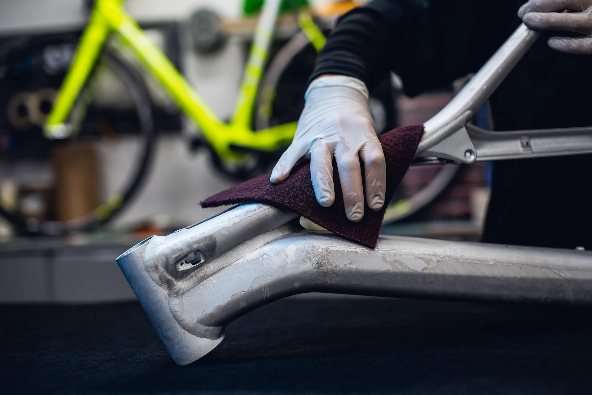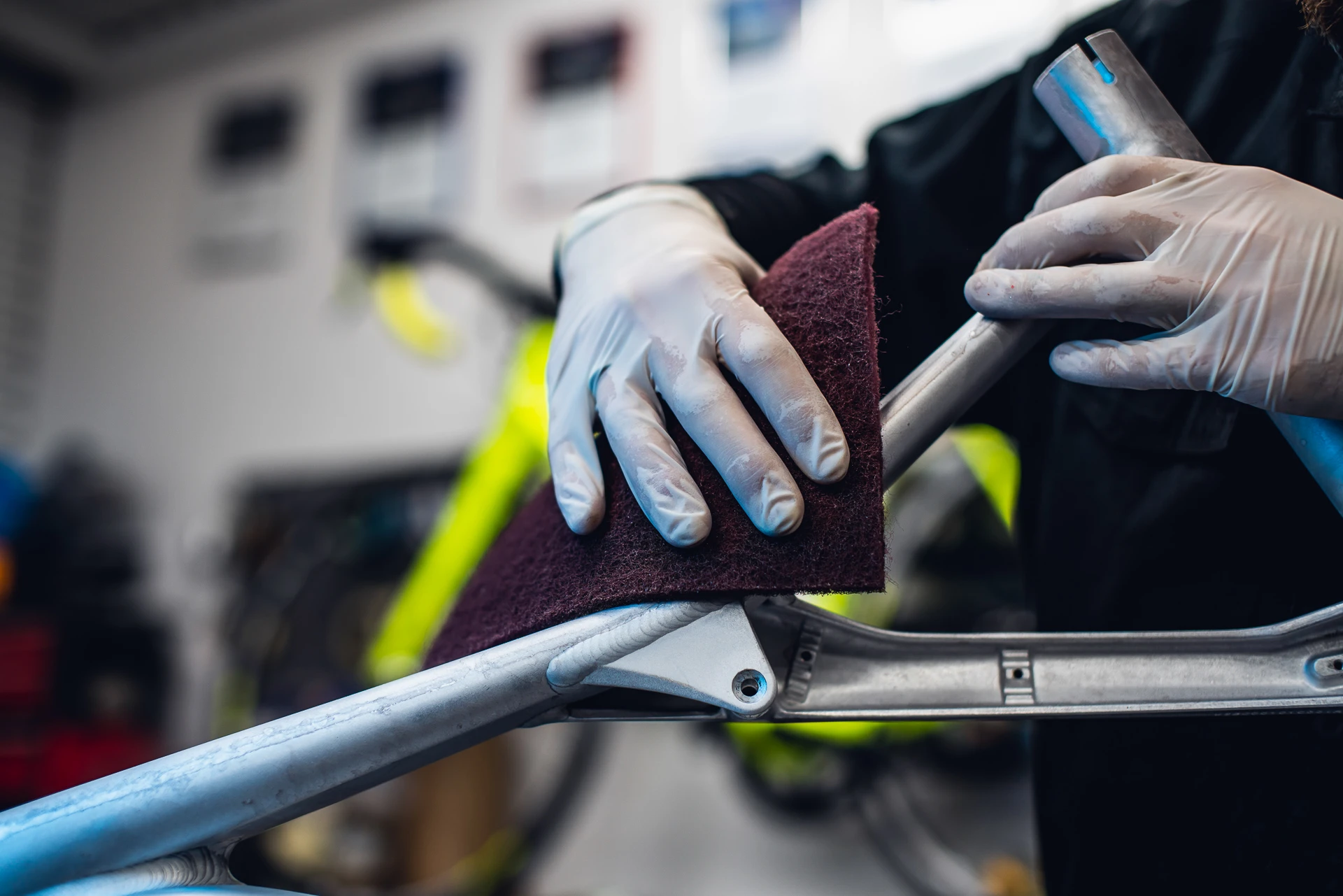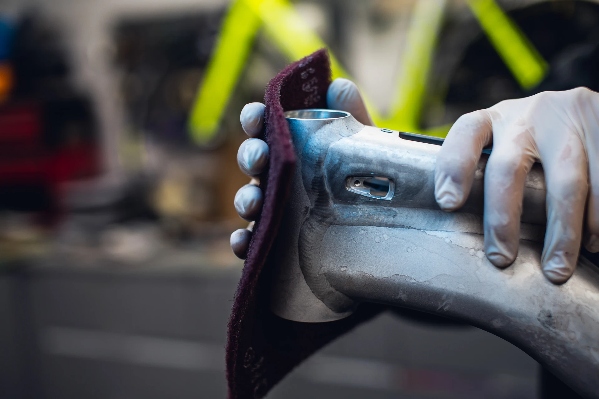 Moglibyśmy podjąć próbę usunięcia lakieru jak w przypadku karbonu, ale nie ma to większego sensu, a przede wszystkim jest to czasochłonne. Papier ścierny nie jest w stanie dokładnie wyczyścić lakieru ze spawów, dlatego w przypadku elementów aluminiowych zawsze usuwamy lakier w 100%, co jest szybsze i znacznie łatwiejsze.